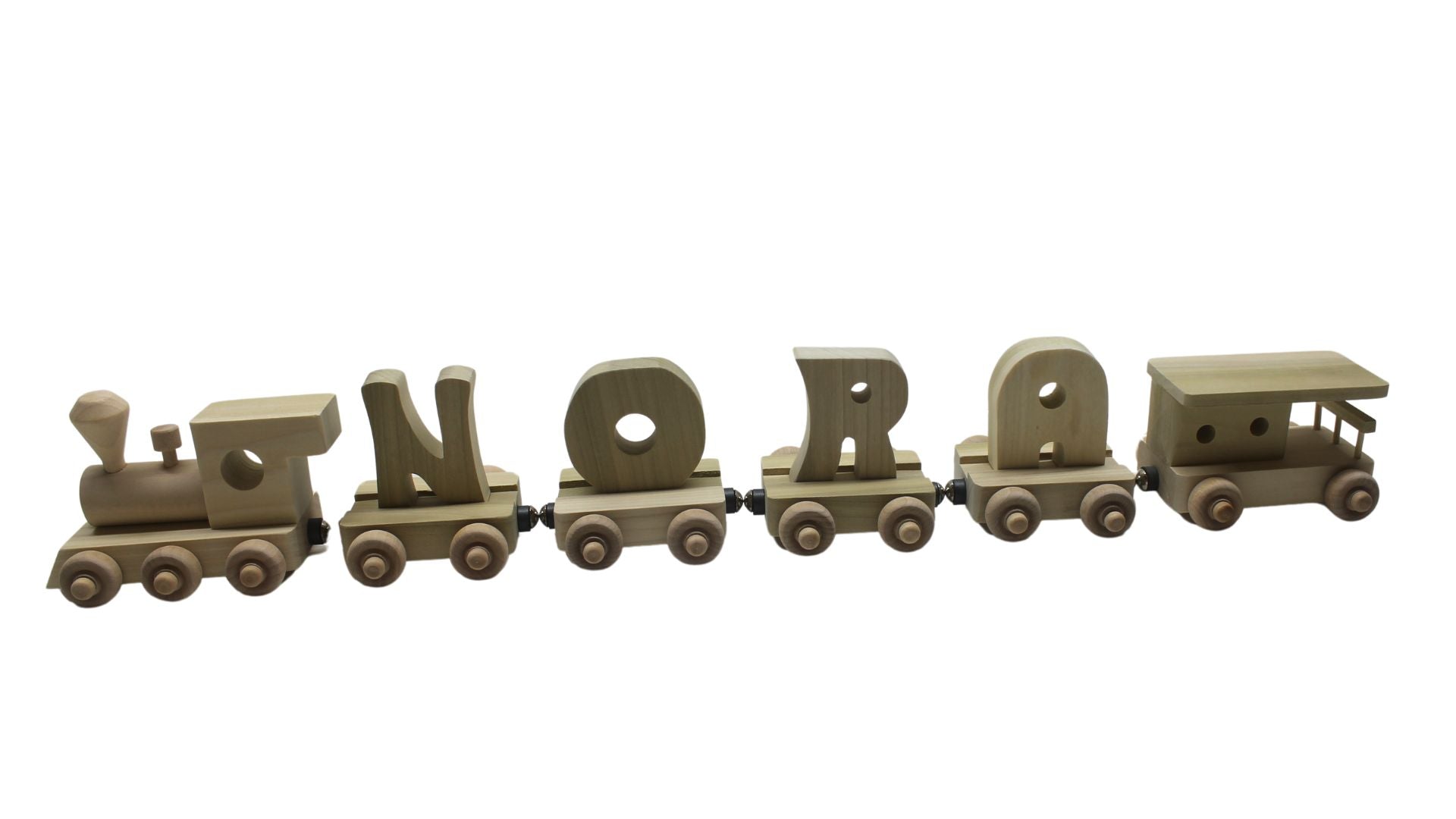 The perfect toy for your little conductor! Our personalized wood toy train set with an engine, cars, and caboose is handcrafted with love and built to last. Made from high-quality, sustainable wood, this train set comes with the four letters you specify to spell your child's name, making it a treasured keepsake for years to come. Your child will be delighted as they watch the train chug along, creating endless imaginative play. Whether it's for a birthday or holiday gift, our personalized wood toy train set is sure to be a hit with kids of all ages.